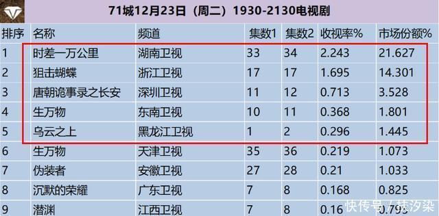 1、《时差一万公里》 收视率:2.243% 主演:罗晋/任素汐/周游 剧情点评:整体来说还算三观正常的电视剧。只是这个嫁老外,然后离婚搬家无缝衔接这人设太败好感了。李道奇这个人设神神叨叨的,演得不错,演的有种莫名压抑不安感,我看到他的第一眼就知道他不会有好结果。更喜欢年轻那条线,所有误会都能和解,也没有意难平。甚至还有个好朋友来拯救他们。而张冉这条线,却要靠好朋友的死亡来唤醒。如果他们成功了,婚姻或许就保不住了,真的很讽刺。追求欲望的路上,更多的是自我迷失。所以总的来说,整体剧集质量只能说是中规中矩吧,能看,但还是有些细节上经不起推敲。